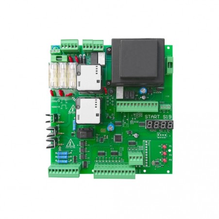 Steuergerät mit Phasenanschnitt, für 1 Drehstrom-/Wechselstrommotor 230/400V bis 2CV für Schnellfalttüren und Schiebetore. Die Steuereinheit START-S19 führt einen Phasentest durch, der folgende Ergebnisse liefert: einphasiger Anschluss/dreiphasiger R-S-T-Anschluss in umgekehrter Reihenfolge (das Steuergerät vertauscht automatisch das Öffnen und Schließen des Motors), dreiphasiger R-S-T-Anschluss in der richtigen Reihenfolge. Encoder-Anschluss. Eingänge: Startuhr, Foto im Kanal, Fotodraht im Kanal, Antibündelungssicherheit, Endschalter in AP und Kanal, Fußgängersteuerung, Kompass, Stopp, Verlangsamungsschalter in AP und Kanal. NC- oder 8K2-Kontakt-Sicherheitsleiste. Das Bremsmanagement erfolgt bei Vorhandensein/Fehlen von 230 V. Betriebs- und Programmierlogik wie START-S12. Nur Platine, ohne Verpackung.