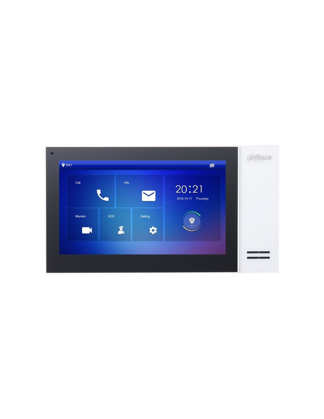 Monitor interno de videoportero IP con acabados blancos, pantalla LCD de 7", resolución 1024x600, 1 puerto LAN 100 Mbps, pantalla táctil capacitiva, 6 entradas y 1 salida de alarma, ranura micro SD, montaje en pared o escritorio (con soporte VTM123), alimentación 12 Vdc/PoE <5 W