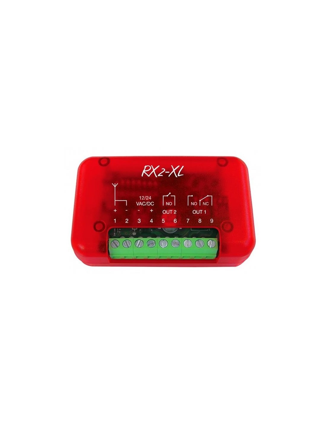 Récepteur bicanal auto-apprenant, gère les codes standards de 12 à 80 bits, Rolling HCS© ou Rolling EB. A l'aide de 8 dips, vous pouvez activer ou désactiver : Gestion du code Rolling HCS©/EB, temps de rétention des sorties de 0,8 à 0,3s, pas à pas, gestion du code timing, déphasé et mixte. La radio 433 MHz est intégrée. Avec les 9 bornes vous pouvez choisir les deux sorties NO/NC. 3 LED de signalisation, 2 boutons pour la programmation.